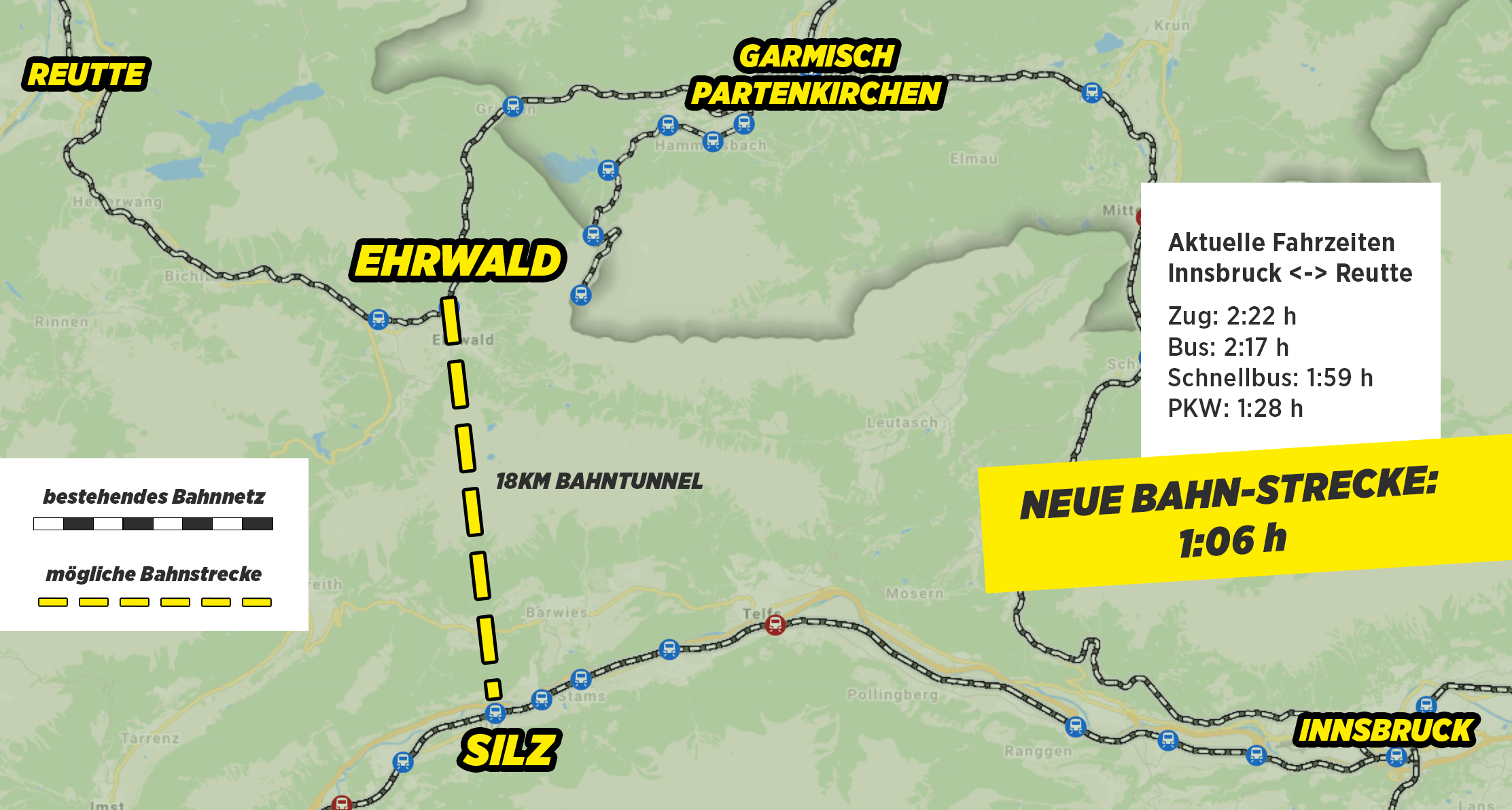 In 1 Stunde und 6 Minuten von Reutte nach Innsbruck mit dem Zug. Es ist ein Jahrhundertprojekt, das das Außerfern mit dem Inntal verschmelzen würde. Ein neuer Wirtschaftsraum könnte entstehen. Was es dafür braucht? Das Einlenken der ÖVP und das Rückbesinnen der SPÖ auf ihr eigenes (!) Wahlprogramm, in dem es heißt: „Der Bahntunnel ist die beste und nachhaltigste Antwort für die Zukunft in dieser Region.“