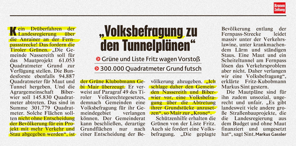„Kein Zentimeter zusätzlicher Straße auf der Fernpassstrecke. Die Menschen im Bezirk Reutte wollen keine zweite Transitroute. Jede Verbesserung an der Autostrecke würde nur noch mehr Verkehr, Lärm und Luftverschmutzung ins Außerfern bringen.“